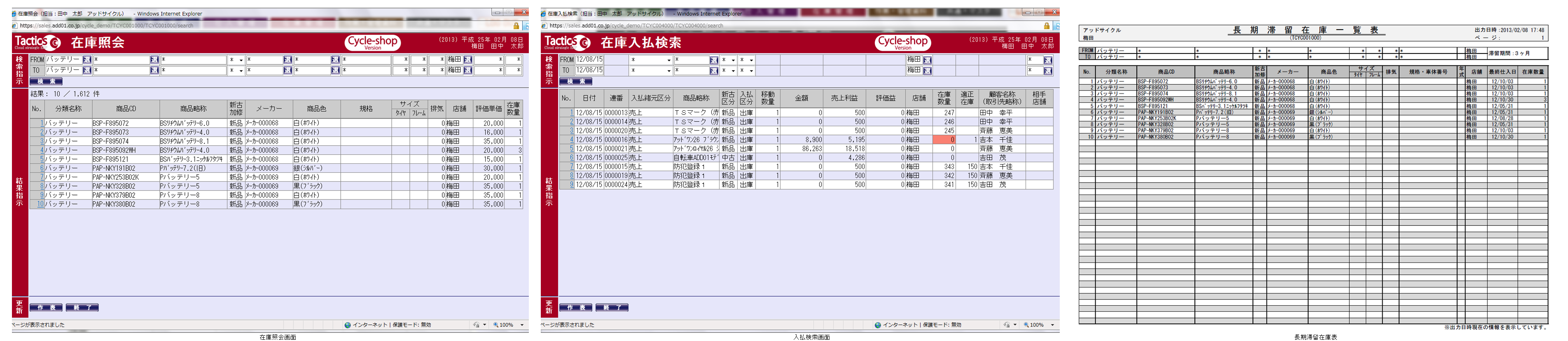 - (帳票)在庫一覧表、不足在庫一覧表、長期滞留在庫一覧表、車両台帳